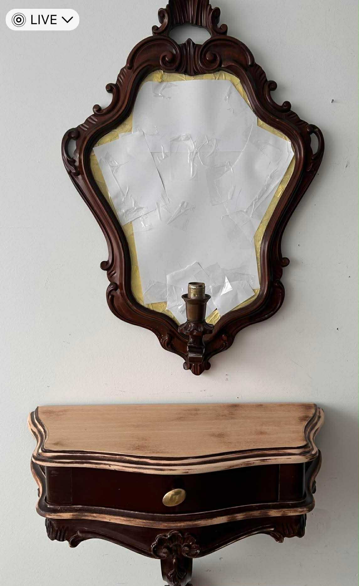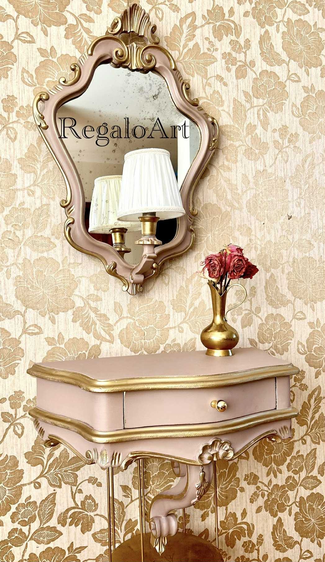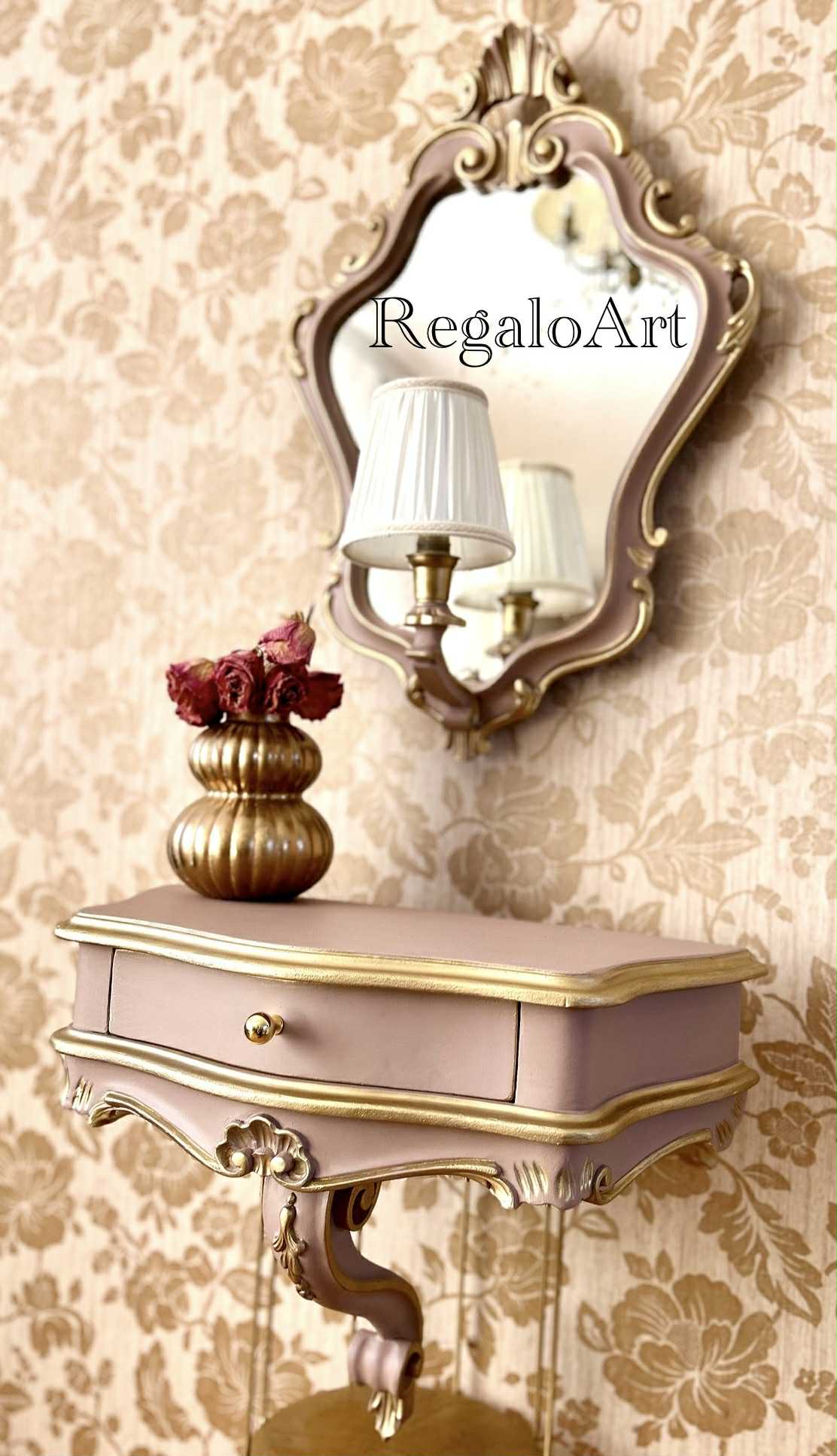 Dimensiuni : consola – L 55, H 45, l 28; oglinda – H 65, diametru 45.