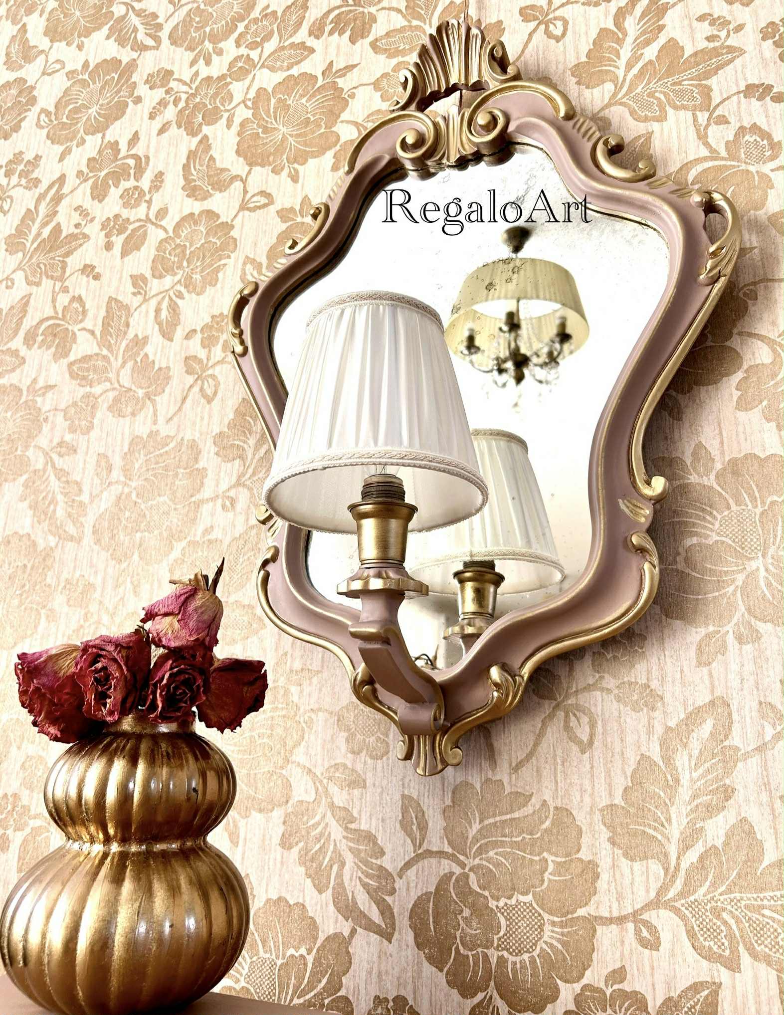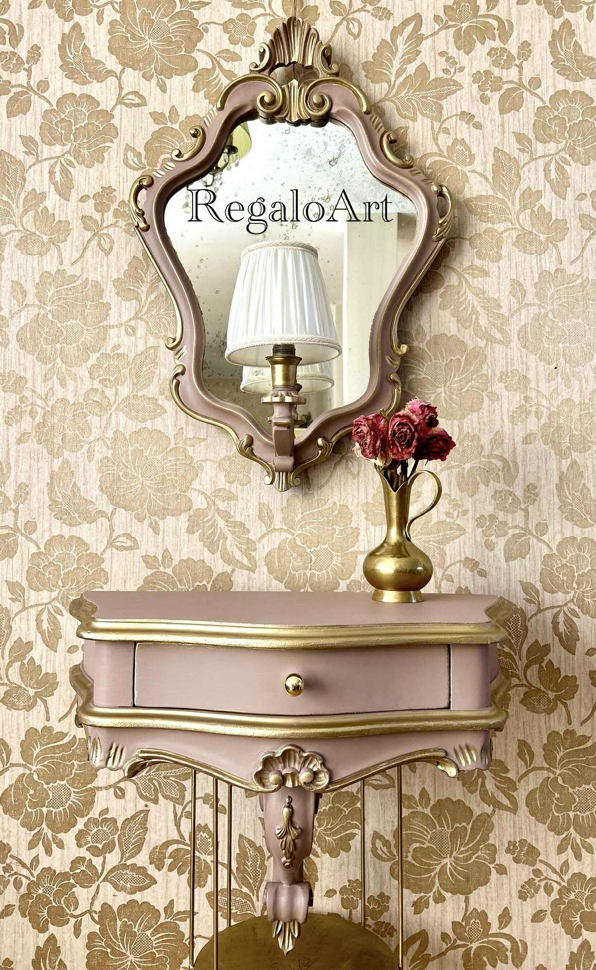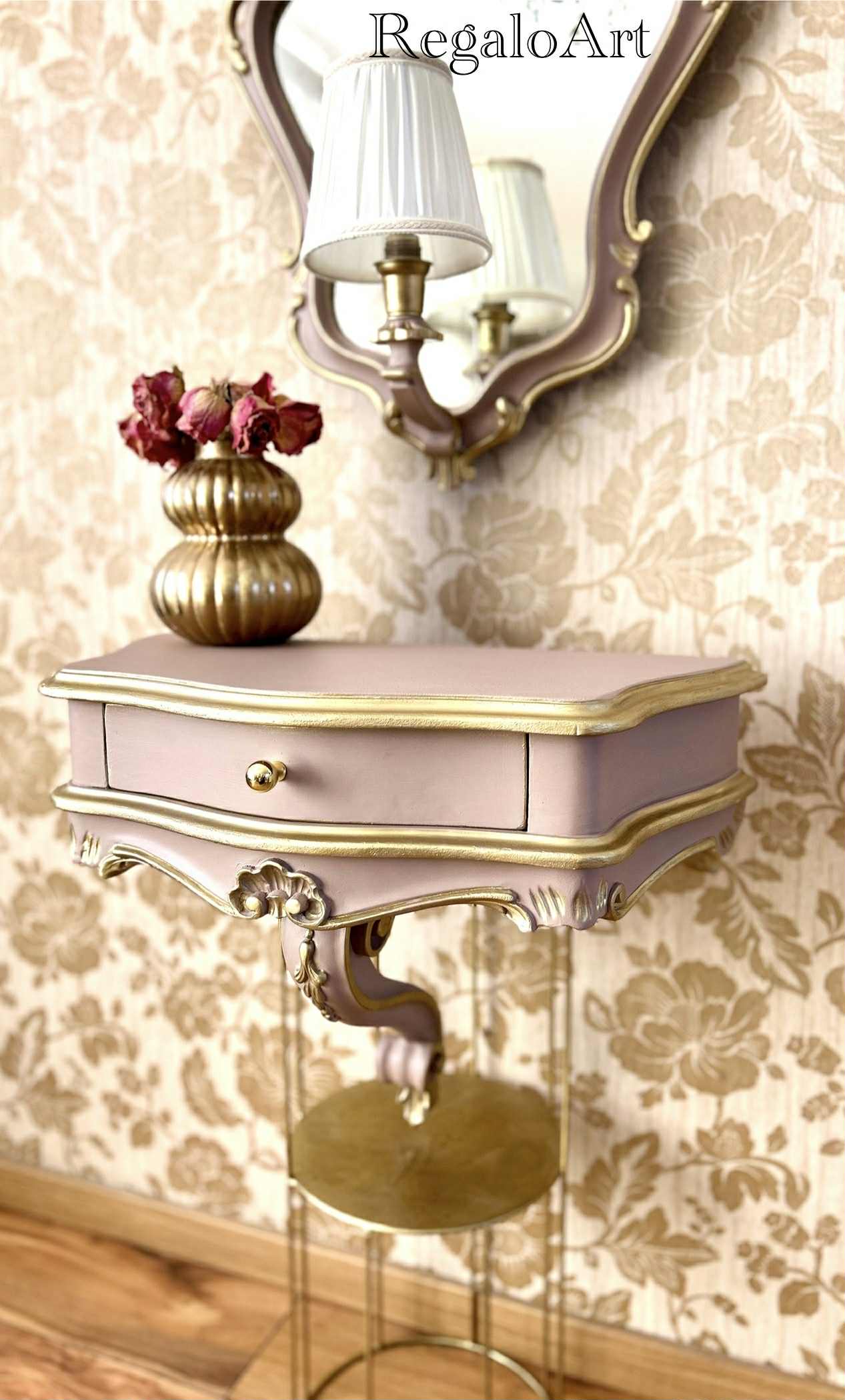 Dimensiuni : consola – L 55, H 45, l 28; oglinda – H 65, diametru 45.